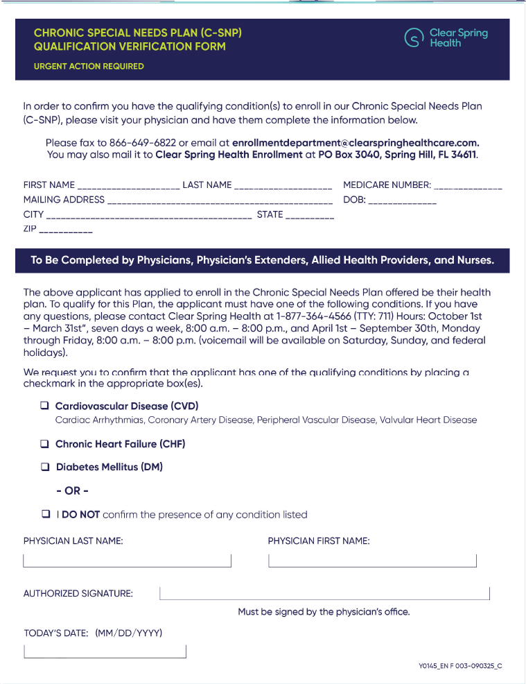 To support timely enrollment and member benefit access and compliance with CMS guidelines, providers must verify the member’s qualifying condition(s) using the 2026 C-SNP Qualification Verification Form.